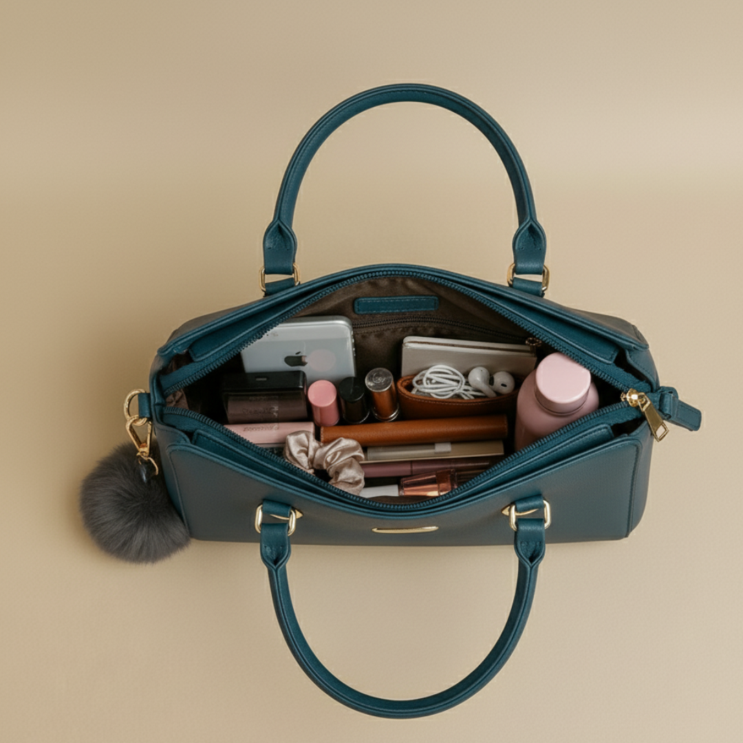 Spacious main compartment for essentials like laptop, wallet, and makeup